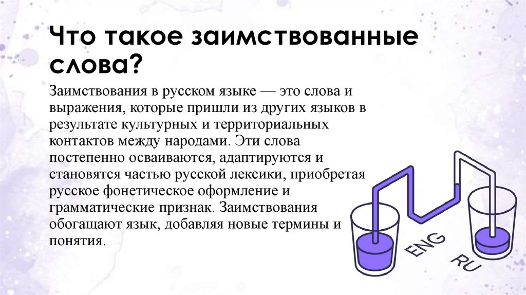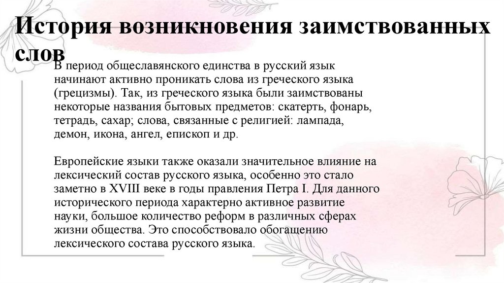 История возникновения заимствованныхсловВ период общеславянского единства в русский язык