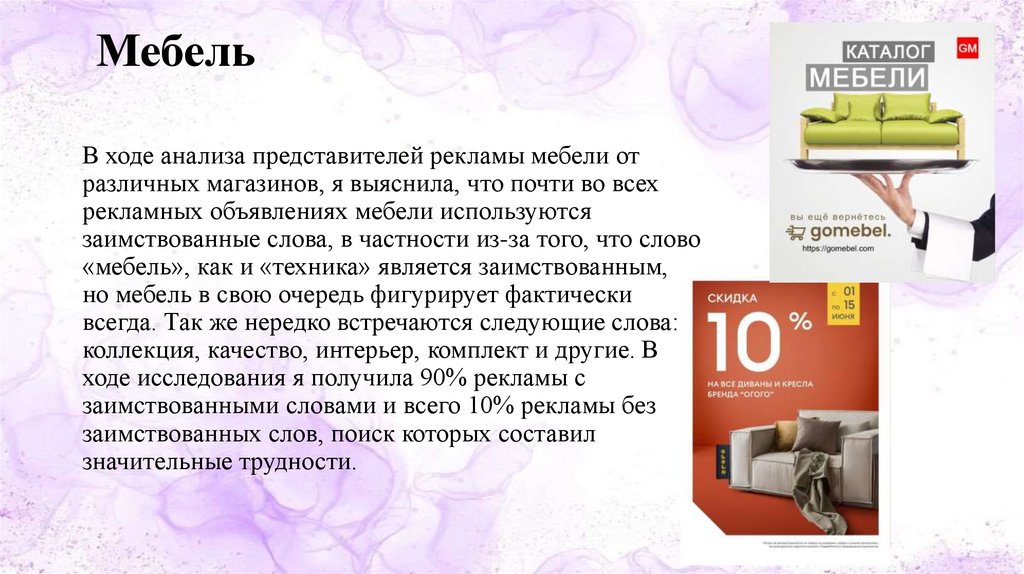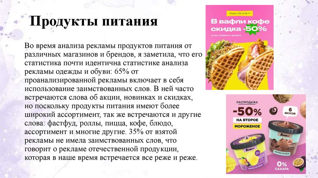 Продукты питанияВо время анализа рекламы продуктов питания от