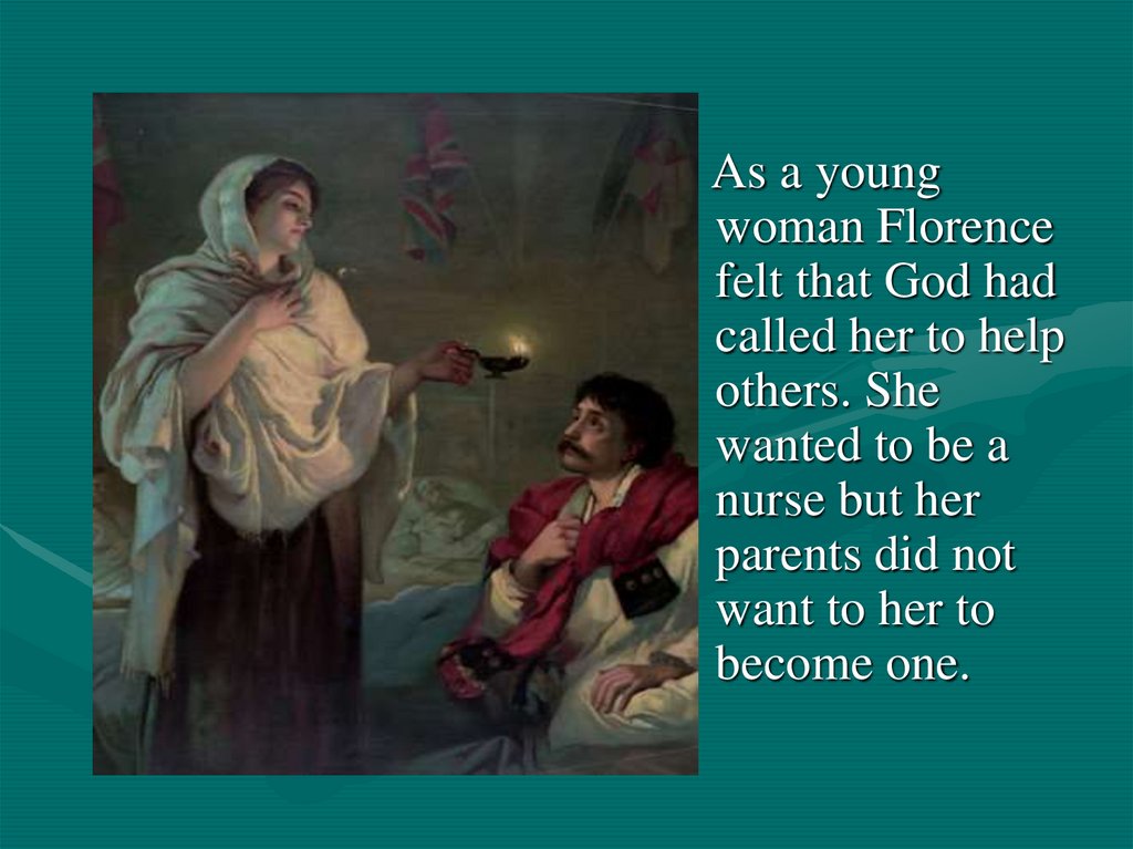 • In 1844 she began to visit hospitals;in 1850 she spent some time with