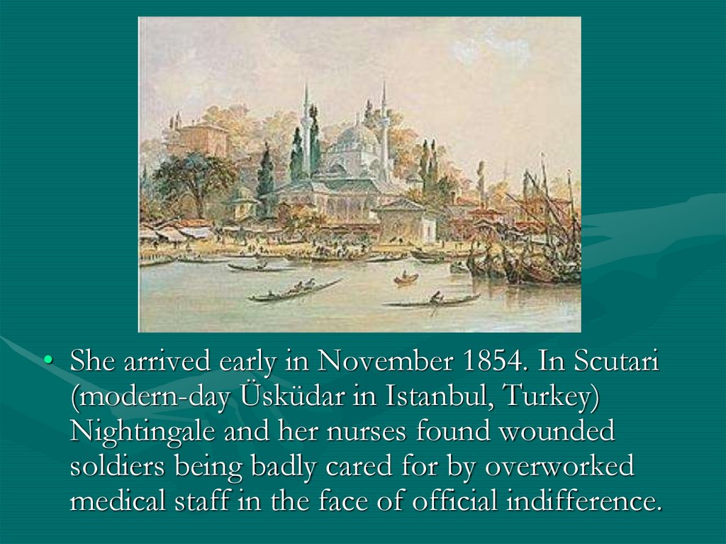 • She arrived early in November 1854. In Scutari(modern-day Üsküdar in Istanbul, Turkey)
