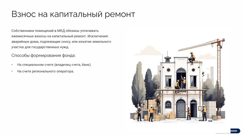 Взнос на капитальный ремонтСобственники помещений в МКД обязаны уплачивать