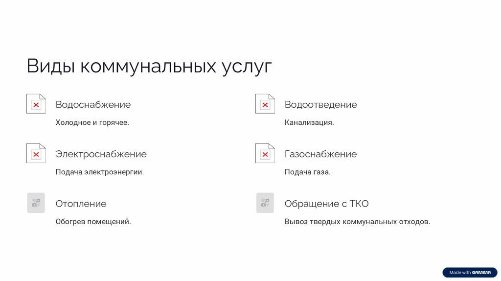 Холодная/горячая вода, электричество, отопление, газ, водоотведение.