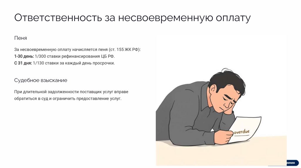 За несвоевременную оплату начисляется пеня (ст. 155 ЖК РФ):