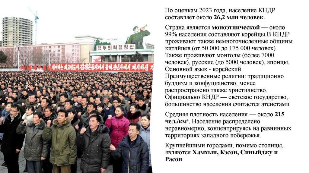 По оценкам 2023 года, население КНДРсоставляет около 26,2 млн человек.