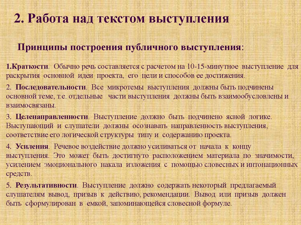 2. Работа над текстом выступленияПринципы построения публичного выступления: