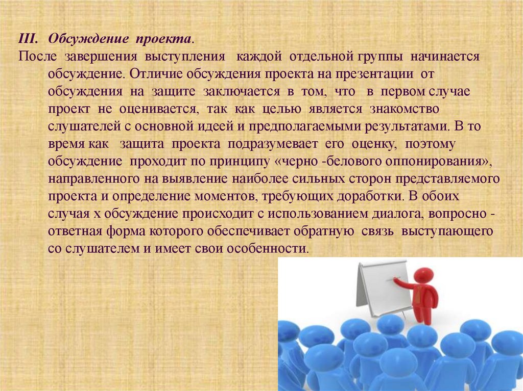 III. Обсуждение проекта.После завершения выступления каждой отдельной группы начинается