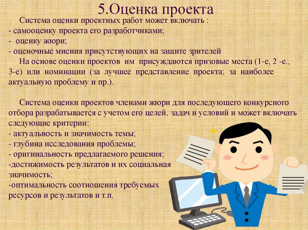 5.Оценка проектаСистема оценки проектных работ может включать :