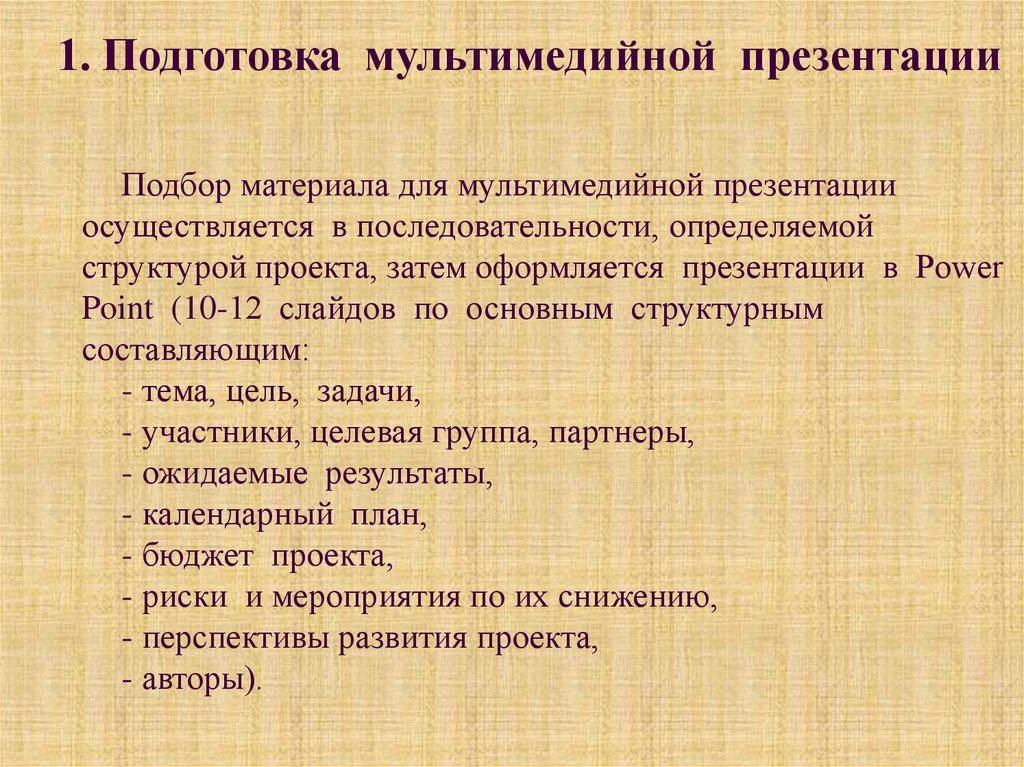 1. Подготовка мультимедийной презентацииПодбор материала для мультимедийной презентации