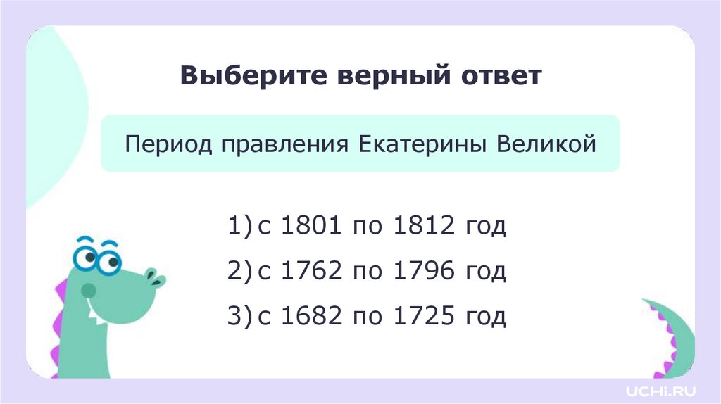 Выберите верный ответПериод правления Екатерины Великой