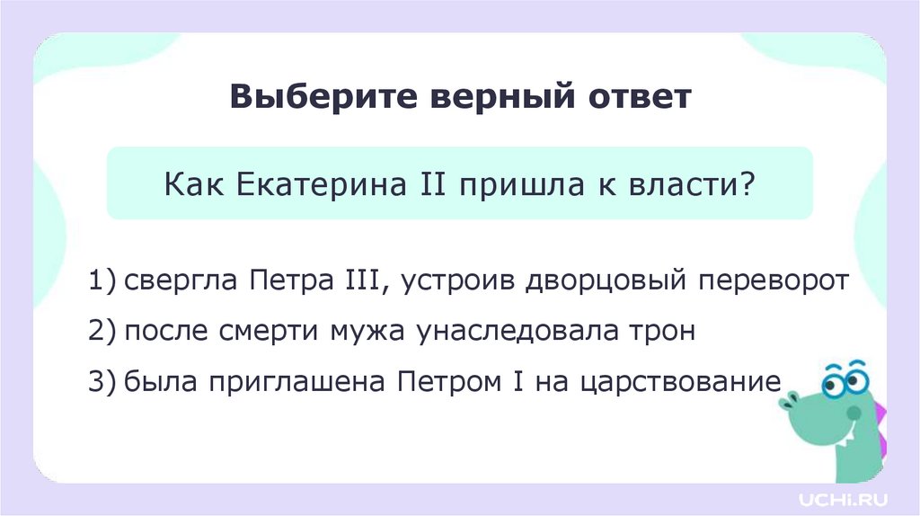Выберите верный ответКак Екатерина II пришла к власти?