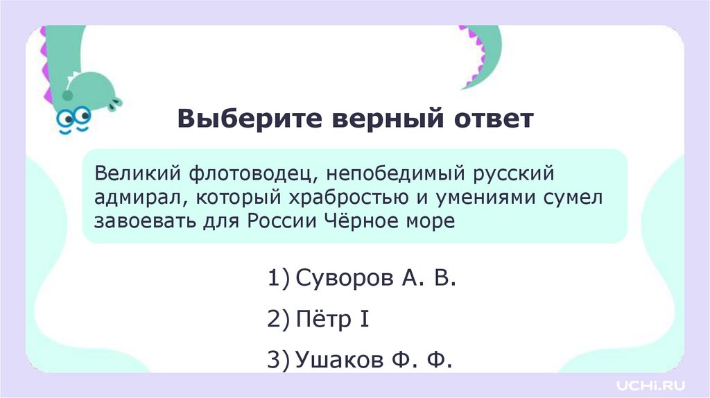 Выберите верный ответВеликий флотоводец, непобедимый русский