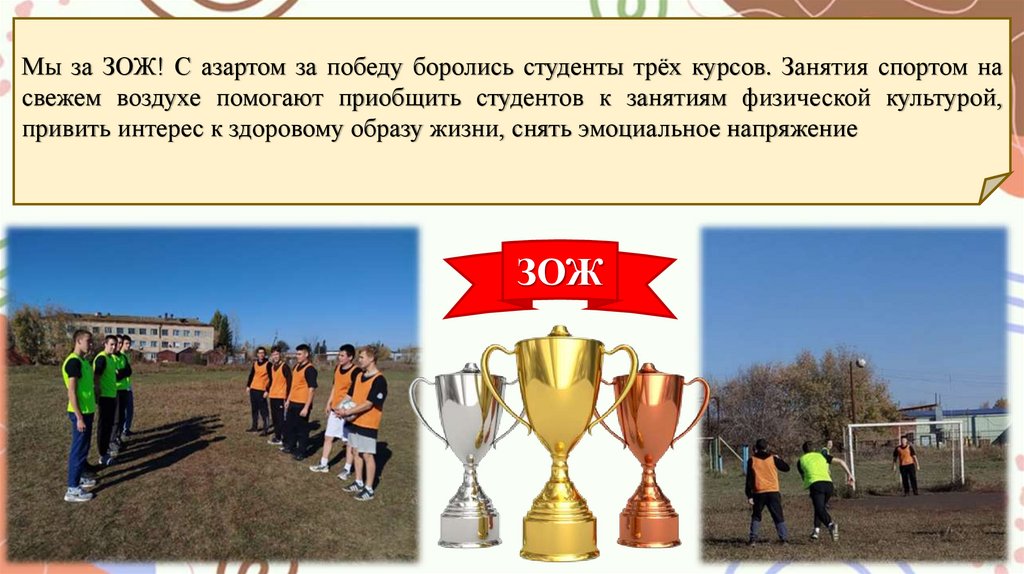 Мы за ЗОЖ! С азартом за победу боролись студенты трёх курсов. Занятия спортом насвежем воздухе помогают приобщить студентов к занятиям физической культурой,