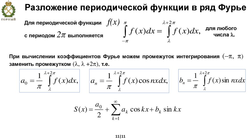 При вычислении коэффициентов Фурье можем промежуток интегрирования (– , )