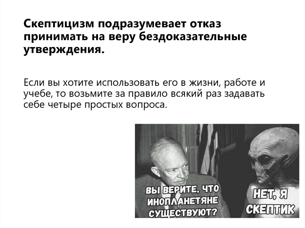 Скептицизм подразумевает отказпринимать на веру бездоказательные