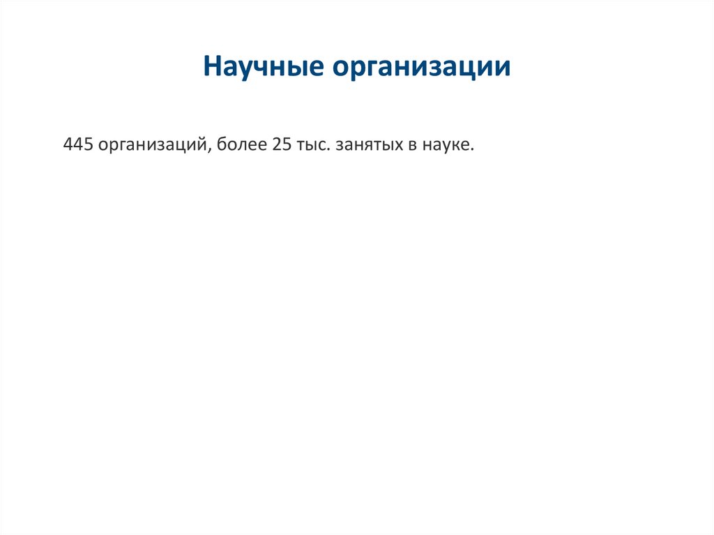 Научные организации445 организаций, более 25 тыс. занятых в науке.
