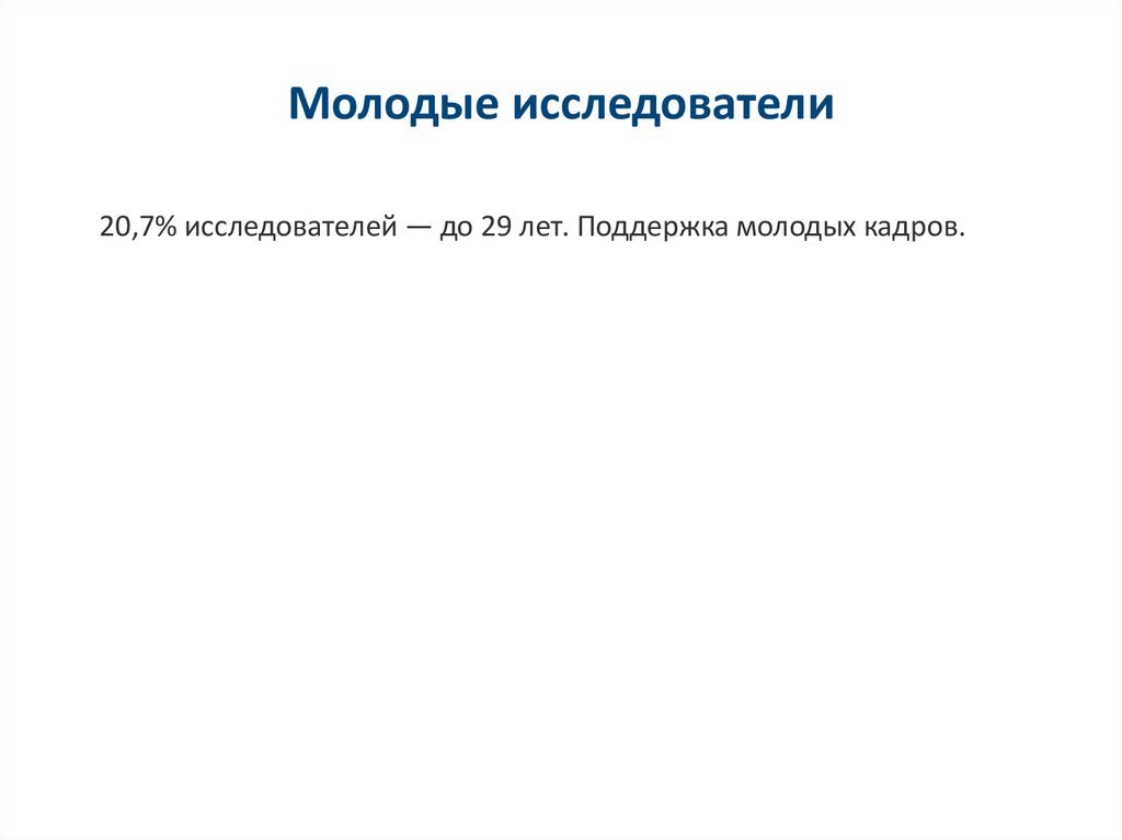 Молодые исследователи20,7% исследователей — до 29 лет. Поддержка молодых кадров.