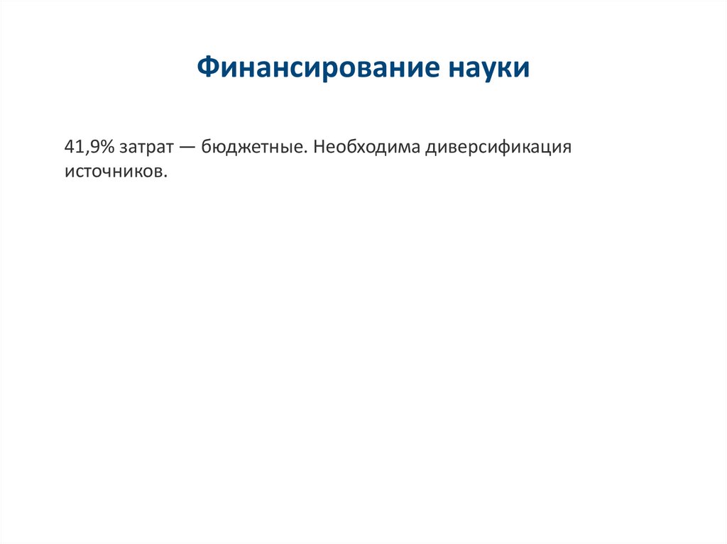 Финансирование науки41,9% затрат — бюджетные. Необходима диверсификация