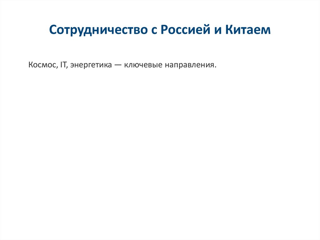 Сотрудничество с Россией и КитаемКосмос, IT, энергетика — ключевые направления.