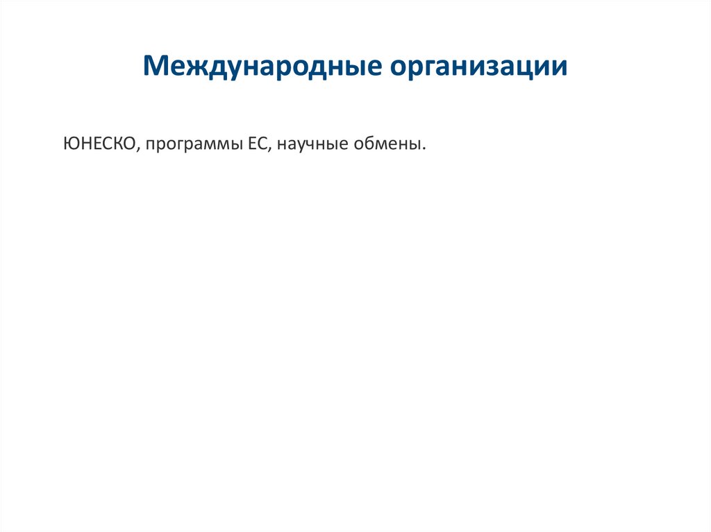 Международные организацииЮНЕСКО, программы ЕС, научные обмены.