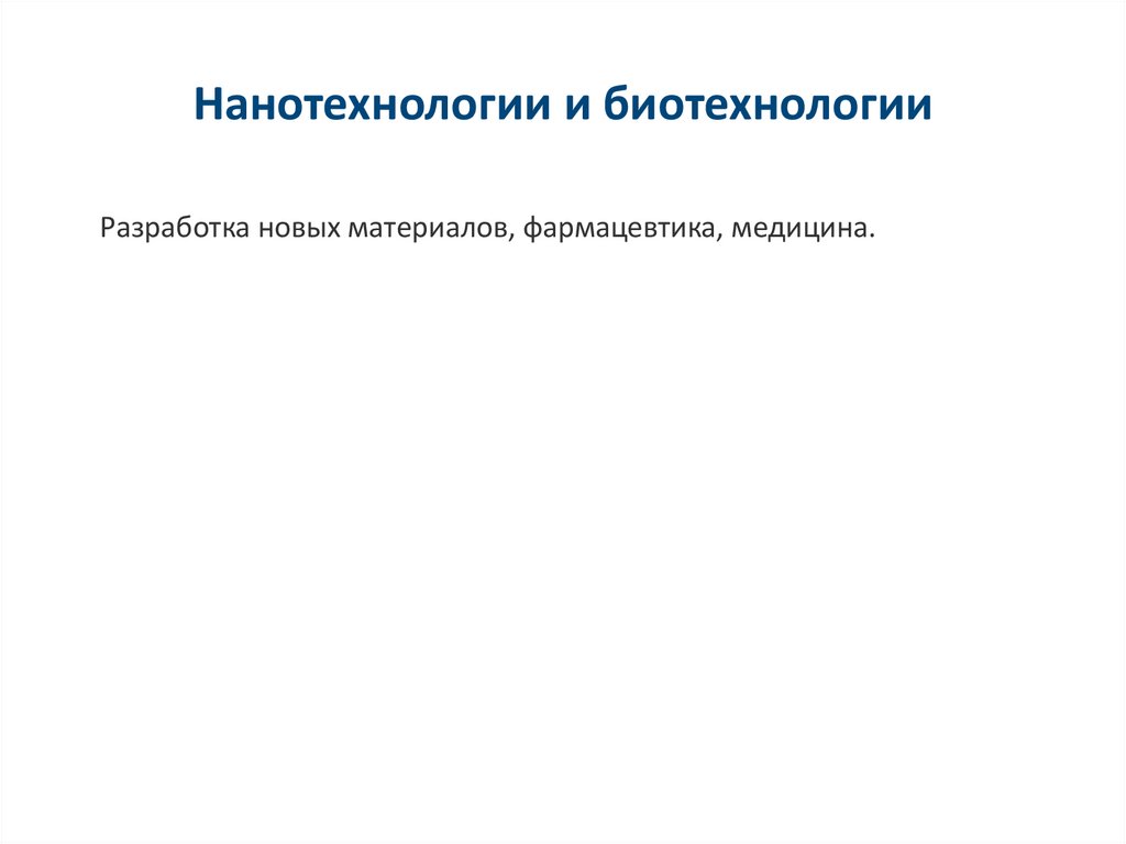 Нанотехнологии и биотехнологииРазработка новых материалов, фармацевтика, медицина.