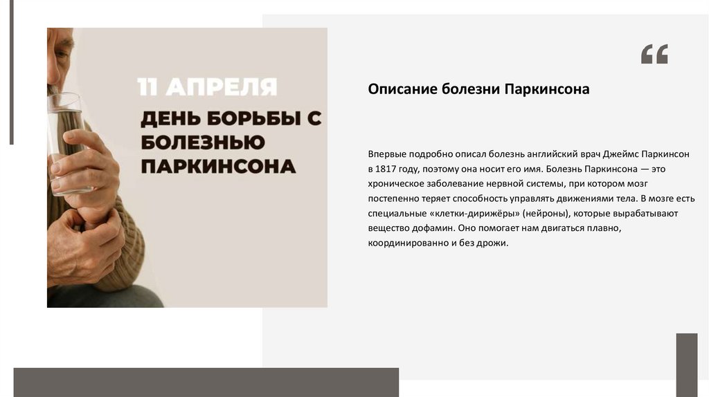 в 1817 году, поэтому она носит его имя. Болезнь Паркинсона — это