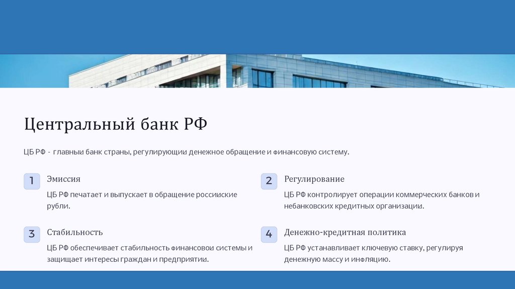 Центральный банк РФЦБ РФ – главный банк страны, регулирующий денежное обращение и финансовую систему.