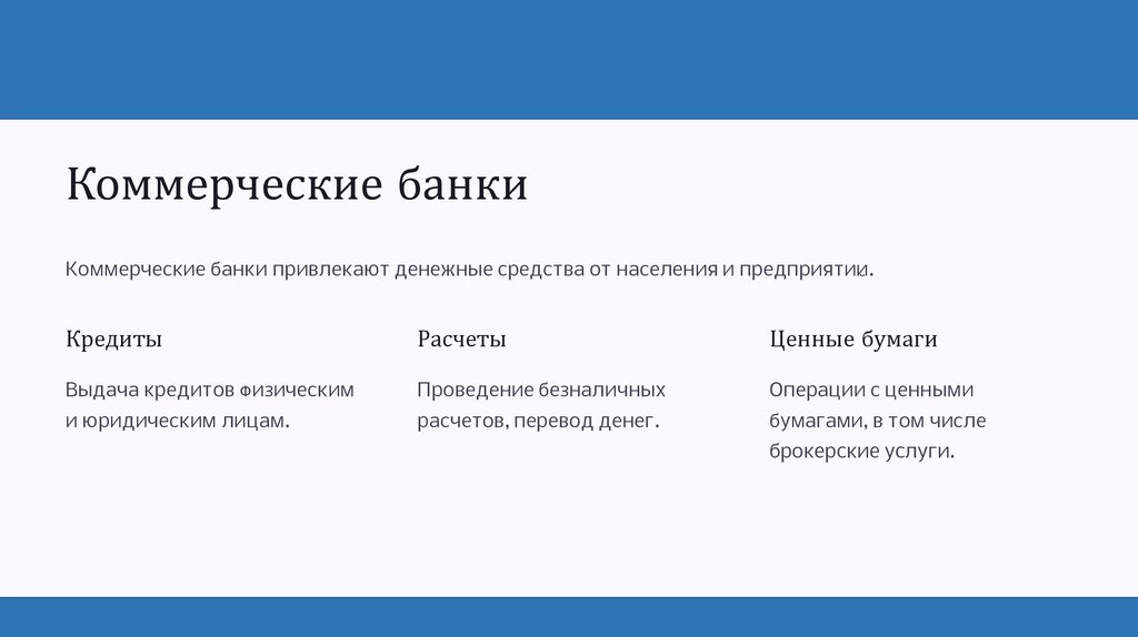 Коммерческие банкиКоммерческие банки привлекают денежные средства от населения и предприятий.