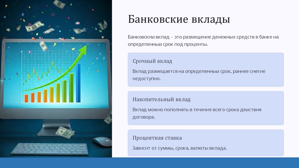 Банковские вкладыБанковский вклад – это размещение денежных средств в банке на