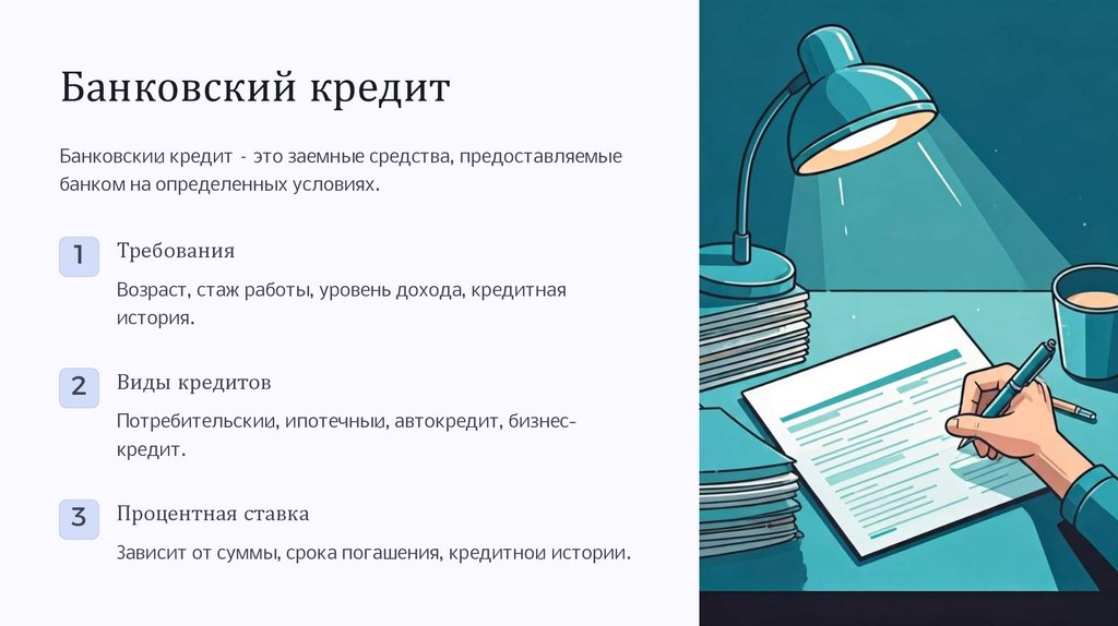Потребительский, ипотечный, автокредит, бизнескредит.