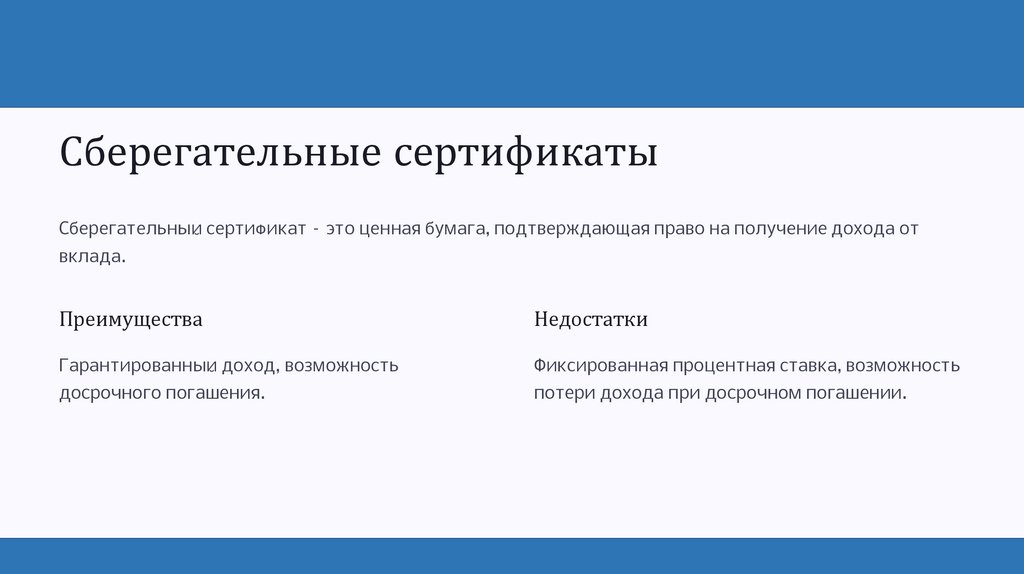 Сберегательные сертификатыСберегательный сертификат – это ценная бумага, подтверждающая право на получение дохода от