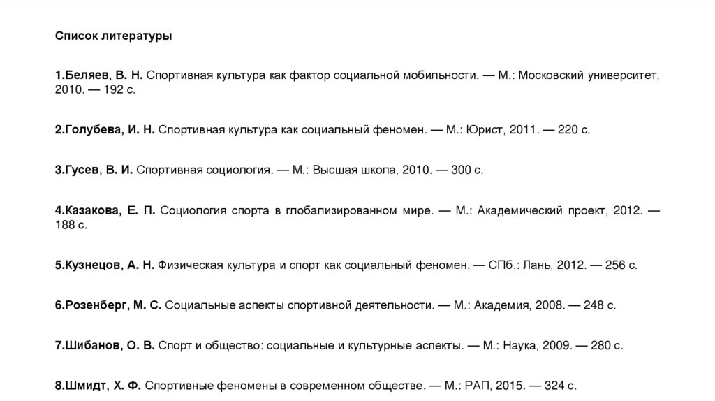 Список литературы1.Беляев, В. Н. Спортивная культура как фактор социальной мобильности. — М.: Московский университет,
