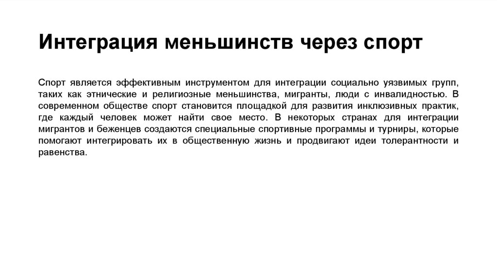 Интеграция меньшинств через спортСпорт является эффективным инструментом для интеграции социально уязвимых групп,