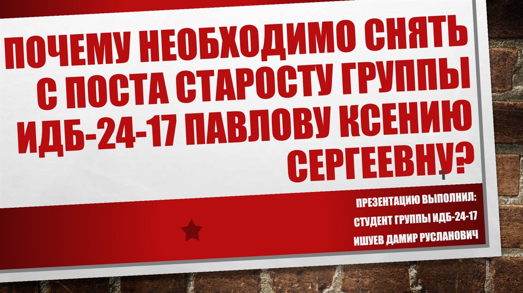 1. Почему необходимо снять с поста старосту группы ИДБ-24-17 Павлову Ксению Сергеевну?