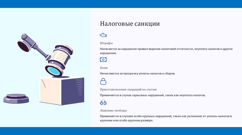 Налагаются за нарушение правил ведения налоговой отчетности, неуплату налогов и другие