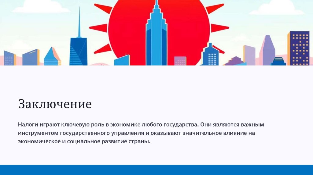 ЗаключениеНалоги играют ключевую роль в экономике любого государства. Они являются важным