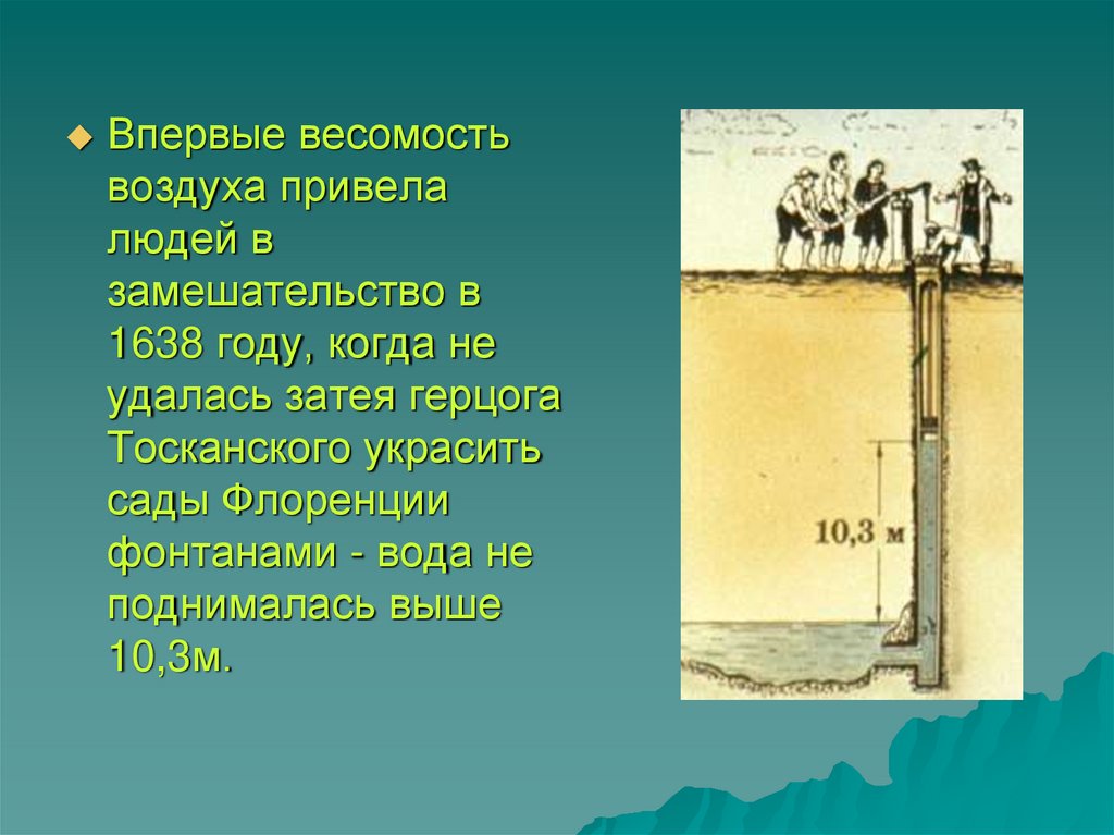 5. Воздух обладает весом: Р=9,8Н/кг*1,29 кг =13 Н (1куб.м)