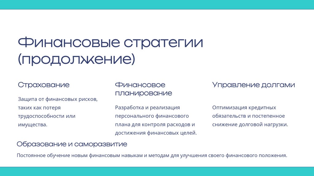 Постоянное обучение новым финансовым навыкам и методам для улучшения своего финансового положения.