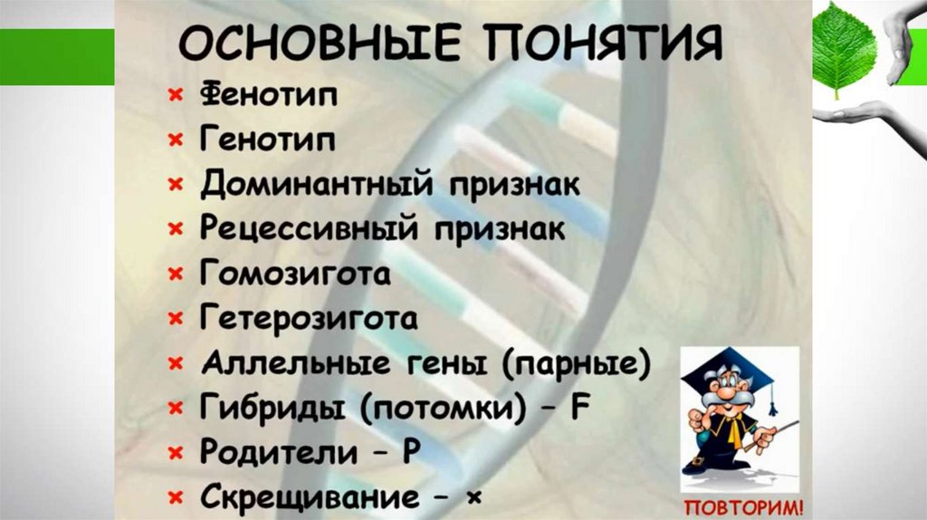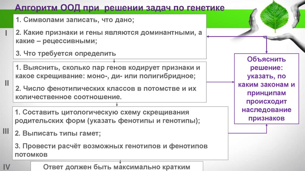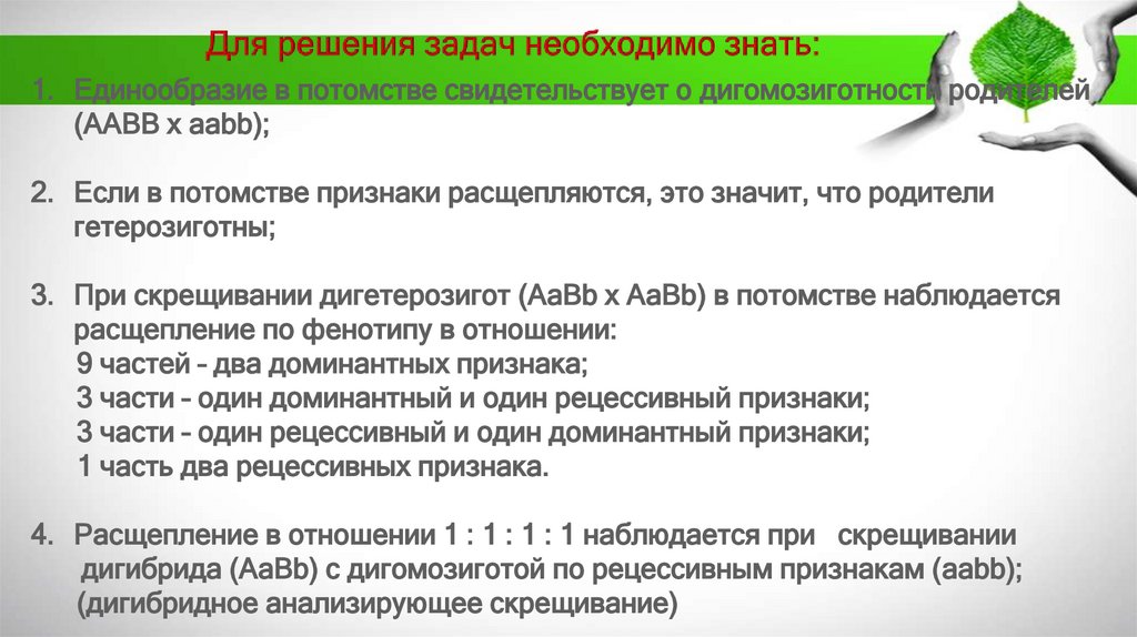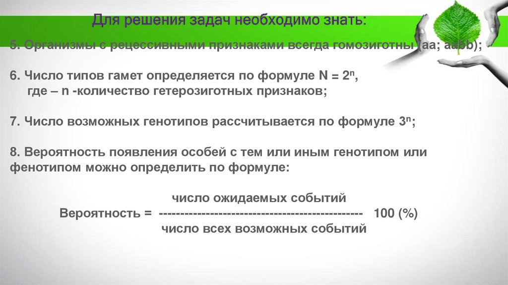5. Организмы с рецессивными признаками всегда гомозиготны (аа; ааbb);6. Число типов гамет определяется по формуле N = 2n,