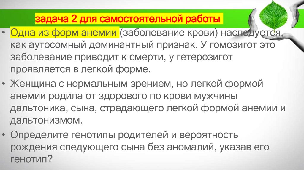 задача 2 для самостоятельной работы• Одна из форм анемии (заболевание крови) наследуется,