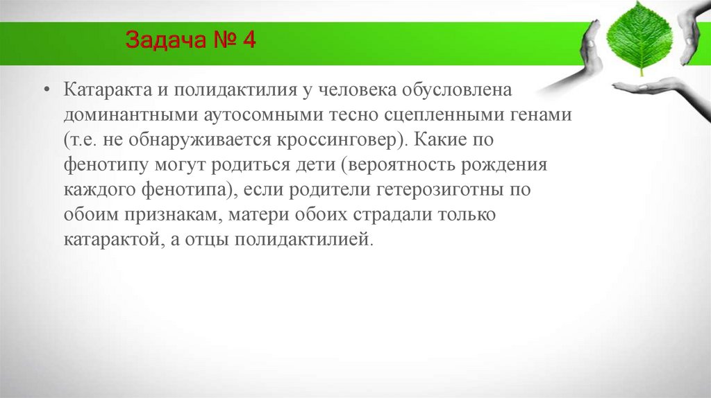 • Катаракта и полидактилия у человека обусловленадоминантными аутосомными тесно сцепленными генами