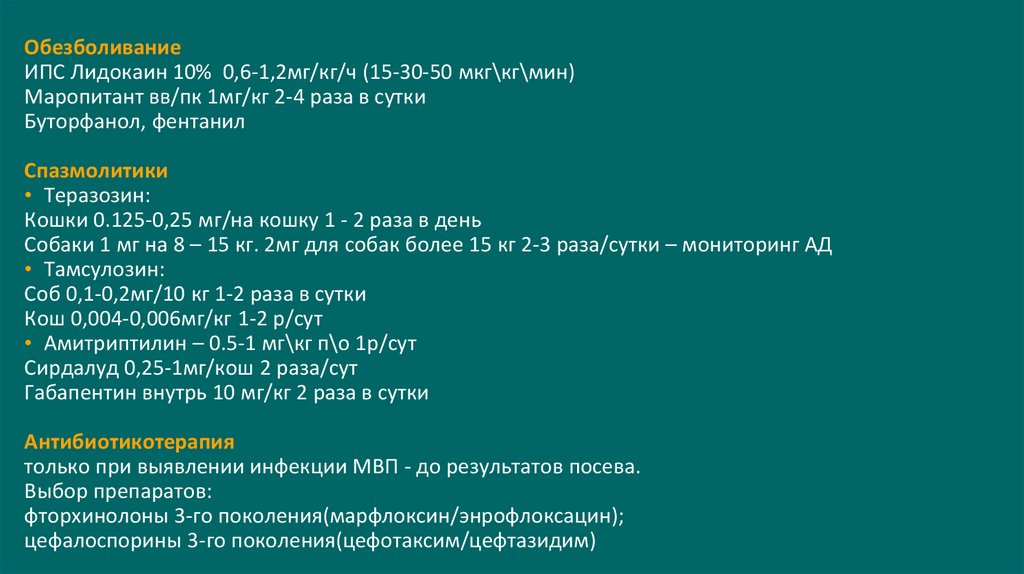 Анестезия/анальгезия.• Золетил 1-3 мг/кг в/в + медетомедин 3-5 мкг/кг в/м