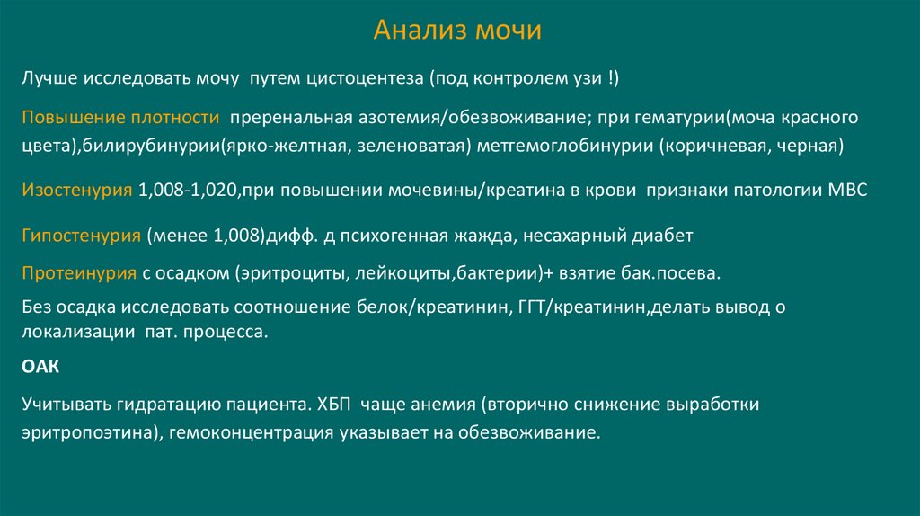 через 1-2 суток азотемия. По ОАМ почечный эпителий.