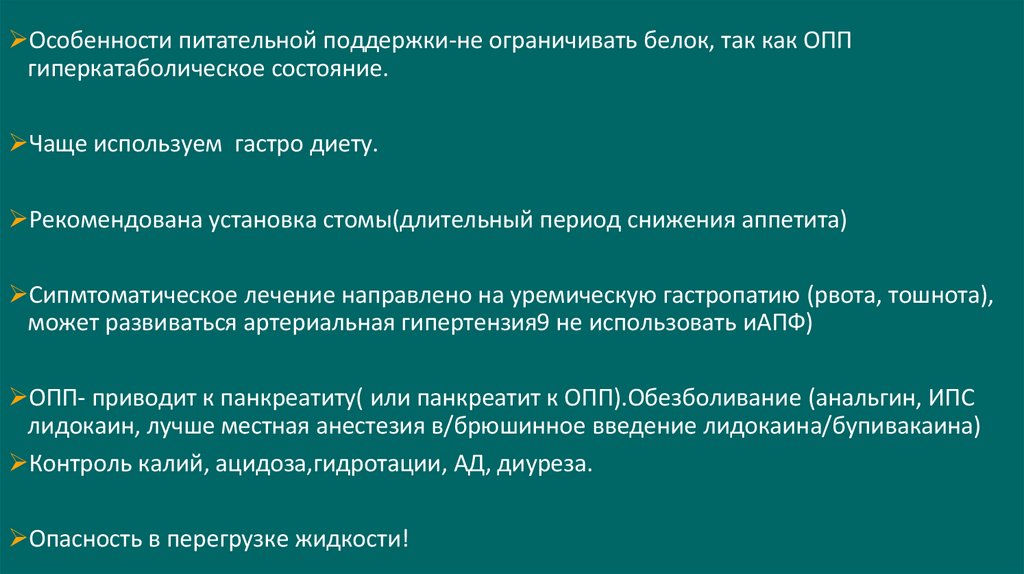 Особенности питательной поддержки-не ограничивать белок, так как ОППгиперкатаболическое состояние.