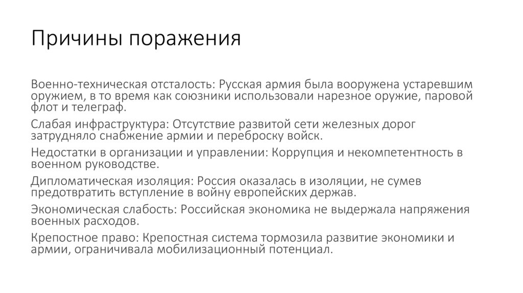 Причины пораженияВоенно-техническая отсталость: Русская армия была вооружена устаревшим
