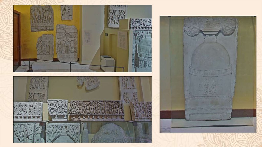 Художественные особенности• Рельефы на буддийские темы. Скульптуры и барельефы изображают сцены из