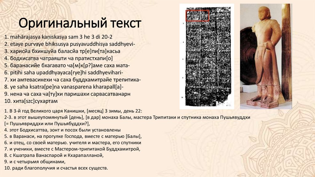 Оригинальный текст1. mahārajasya kaṇiskasya sam 3 he 3 di 20-2
