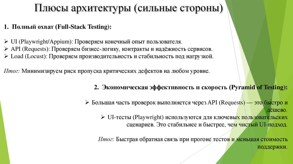 Плюсы архитектуры (сильные стороны)1. Полный охват (Full-Stack Testing):