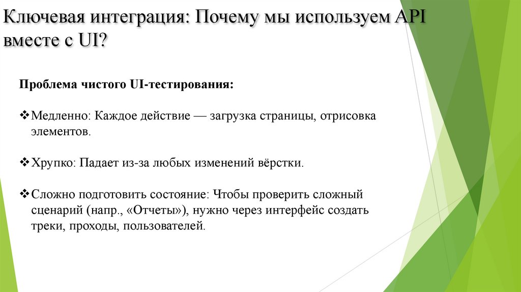 Несмотря на стабильность, UI-тесты (Playwright/Appium) всё