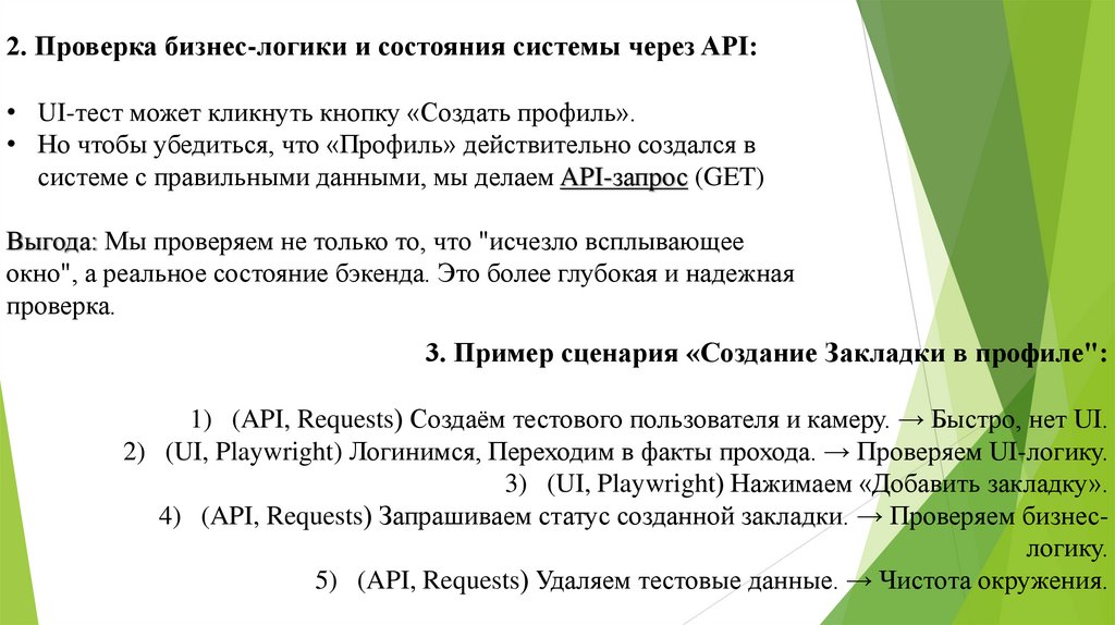 2. Проверка бизнес-логики и состояния системы через API:• UI-тест может кликнуть кнопку «Создать профиль».