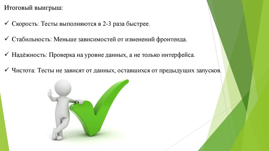 Итог: Быстрая обратная связь при прогоне тестов и меньшая стоимость